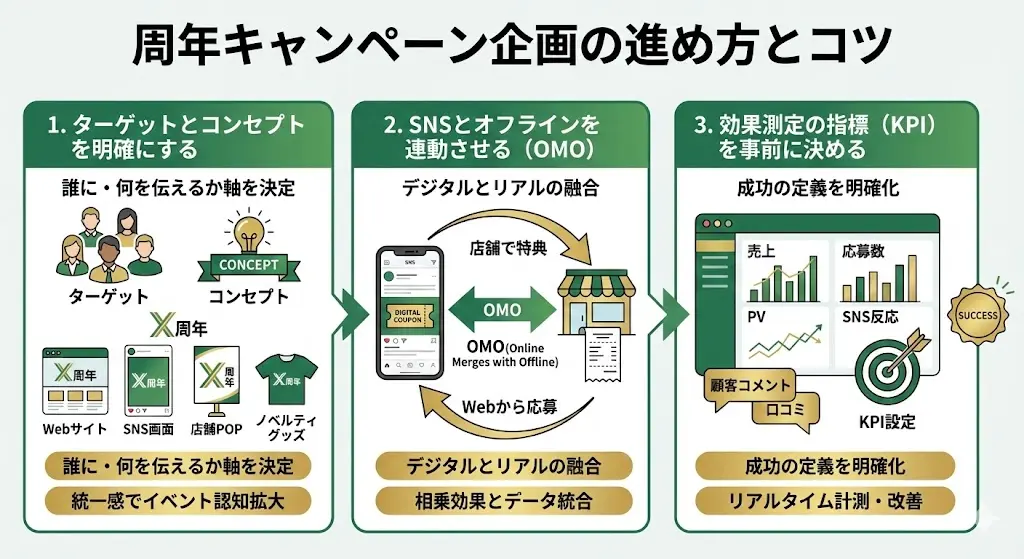 周年キャンペーンは規模が大きくなりやすく、関係者も多いため、入念な準備が必要です。「盛り上がらなかった」「ただ安売りして終わった」という失敗を防ぐために、以下の3つのステップを意識して企画を進めましょう。